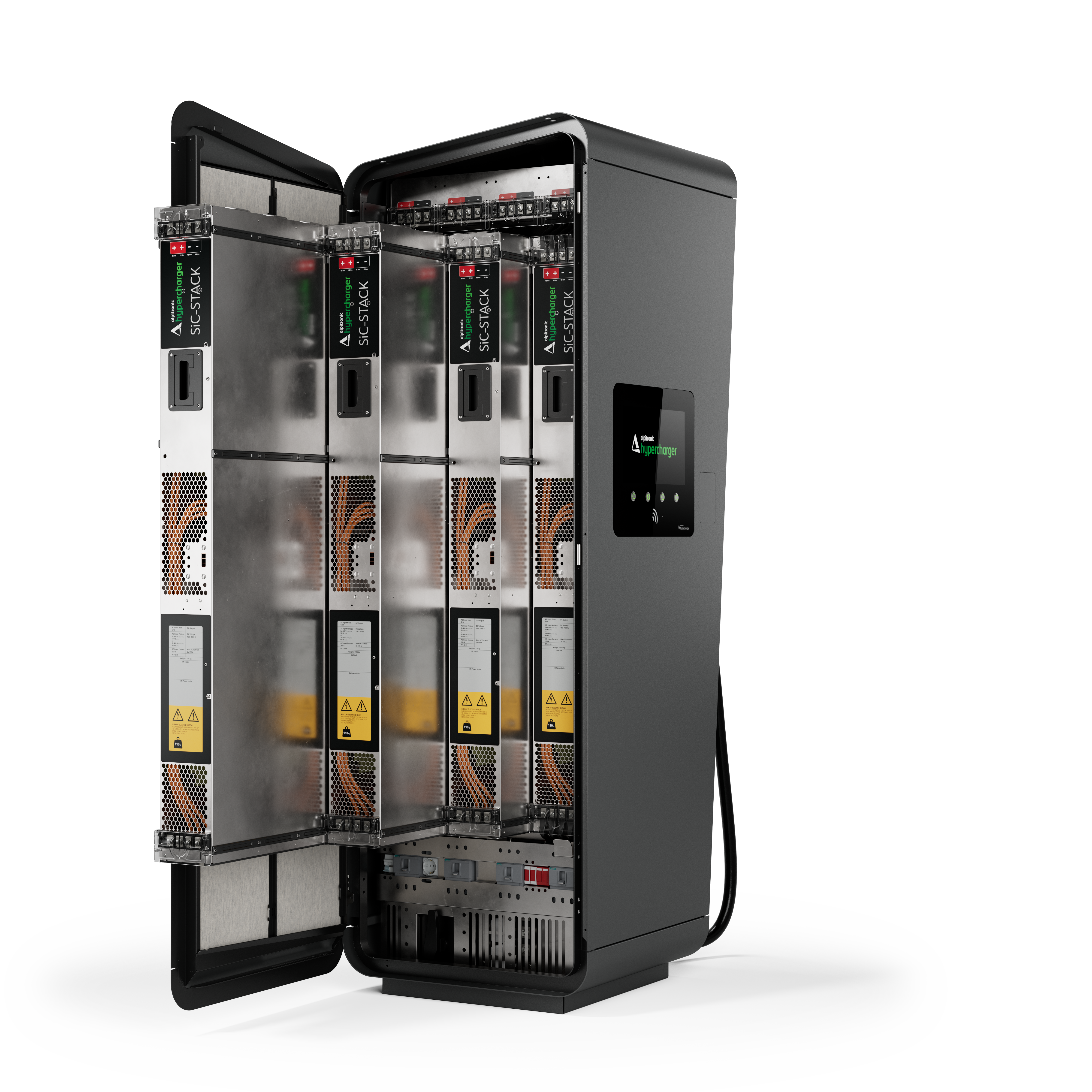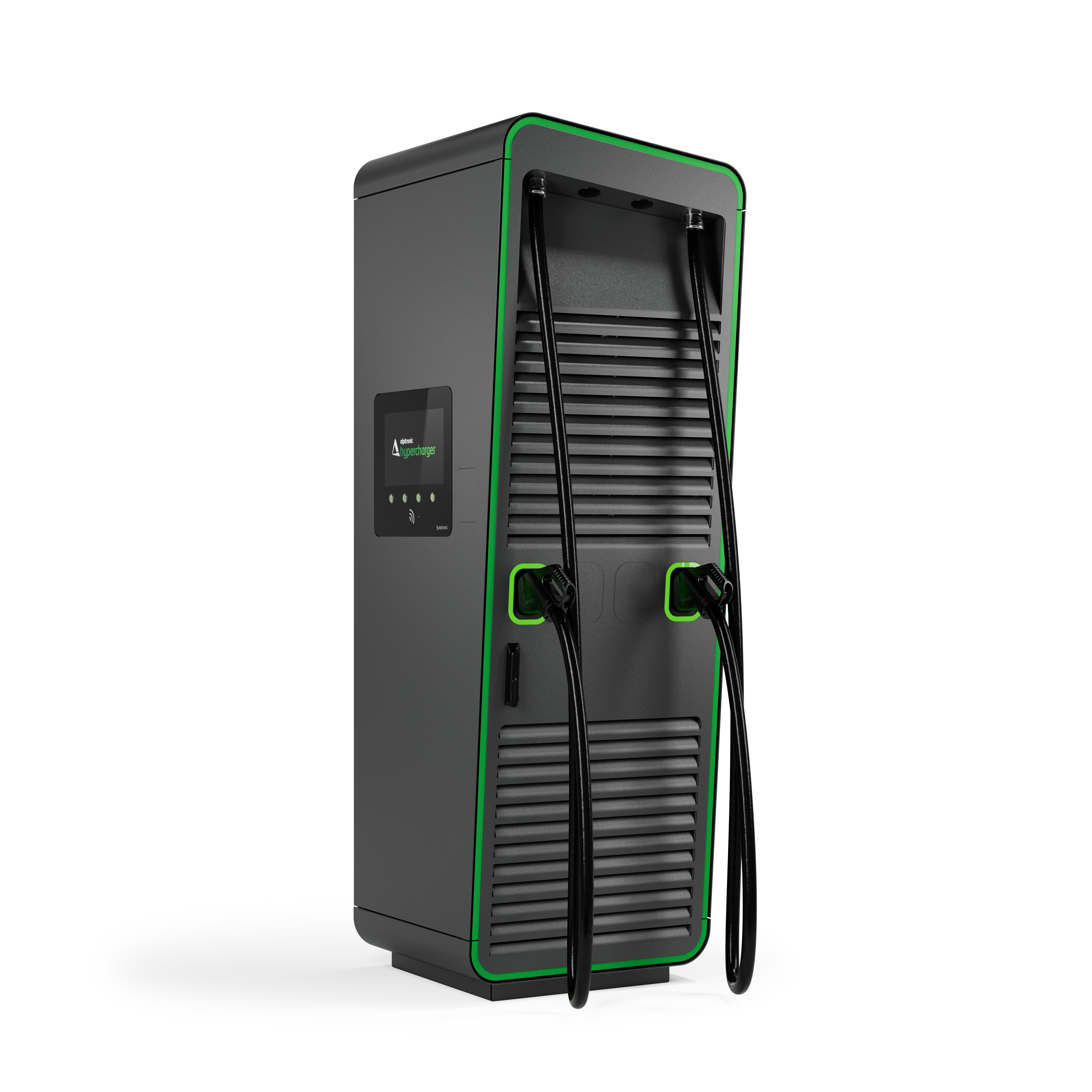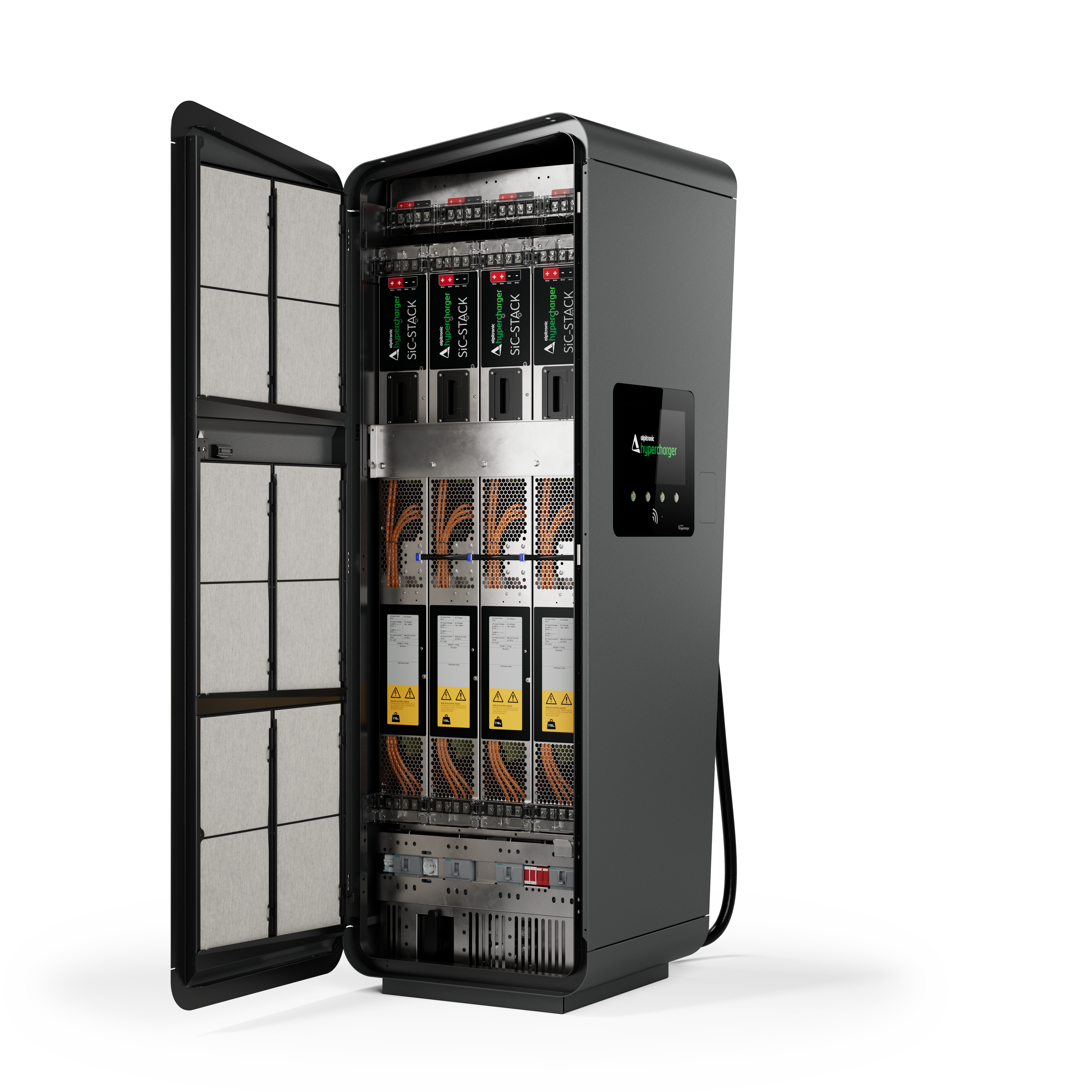 Die Hypercharger-Ladestation ermöglicht superschnelles Laden in schickem, kompaktem Design. Das Modell 400 kann bis zu drei Autos gleichzeitig mit den integrierten CCS- oder CHAdeMO-Kabeln laden.